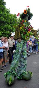 Despite the 2016 Pilton Green Man Day being a rather damp day, contrary to the proven knowledge that the third Saturday in July often has good weather, Pilton nevertheless thronged with crowds throughout the day. It was the perfect opportunity to focus on the friendly local community in this oldest part of Barnstaple. There are a number of great summer events across the North Devon region, and Pilton’s Green Man Day remains one of the most uniquely enjoyable, family-friendly days even when the weather is not so kind. This year Green Man Day had its usual fun mix with the Parade, the Pageant, children’s activities, music, a street market, crafts, food and drink, flowers, charity stalls, displays and street entertainers. Among the street entertainers was Matt Lemon in a new Green Man Stiltskin costume, made with the help of a generous grant from our local councillors on North Devon Council, by Jennie Cooper. The Green Man Stiltskin figure is a crucial figure in the Pilton Green Man Day activities very much representing the spirit of the occasion and being a focus of attention by the public attending, especially the children.